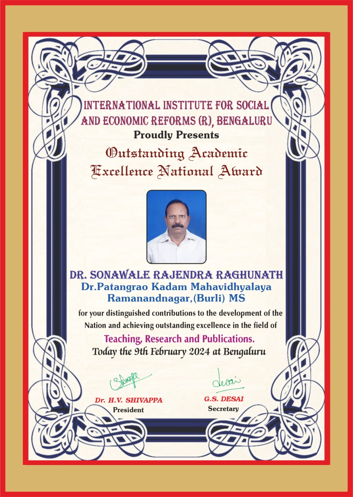 | 2 | Mr.Rajendra Raghunath Sonawale | 03-02-2024 | National | Outstanding Academic Excellence National Award | View |